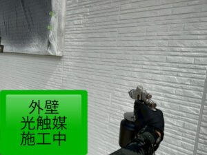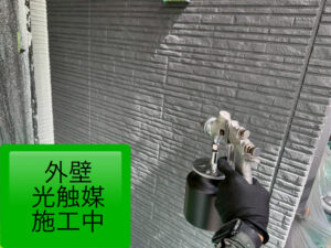 多彩吹き付け完了後は、乾燥期間を24時間以上設け、完全な乾燥確認後、最終仕上げとなる光触媒塗料を、2度に渡り外壁全体に吹き付け、外壁塗装が完了となりました✨️