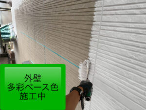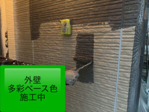 G様邸では、部分的に色分けを取り入れた多彩塗装仕上げをご希望いただいておりましたので、下塗り完了後は、各面ごとに 多彩塗装のベースカラーを丁寧に施工✨