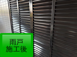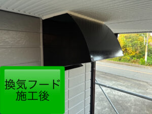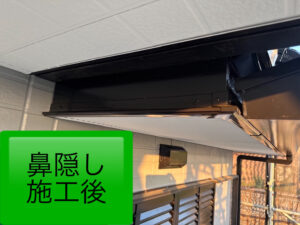 鼻隠し・軒樋・竪樋・モール・雨戸・換気フードなどの付帯部がありましたが、全て艶ありの黒系で塗装を行い、お家全体を引き締まった印象にさせ、重厚感のある仕上がりに✨️