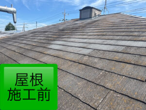 屋根はコロニアル素材で、施工前の状態では苔などの汚れがかなり付着している状態でした💧