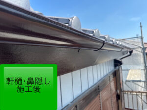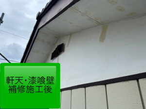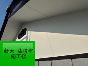 施工前では、細なクラックや、軒天のビスパテ痩せが多々ありましたので、しっかりと補修をしてから塗装を行い、フラットで綺麗な仕上がりに✨️