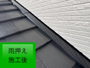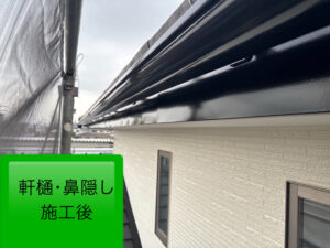 軒樋・鼻隠し・雨押えの塗装においては、既存の黒系塗装が経年により色褪せし、ややくすんだ印象となっていました。そこで、耐候性と美観に優れた艶ありの2液型シリコン樹脂塗料を使用し、丁寧に塗装を施しました。深みのある黒の艶がよみがえり、引き締まった美しい外観へと見事に蘇りました✨